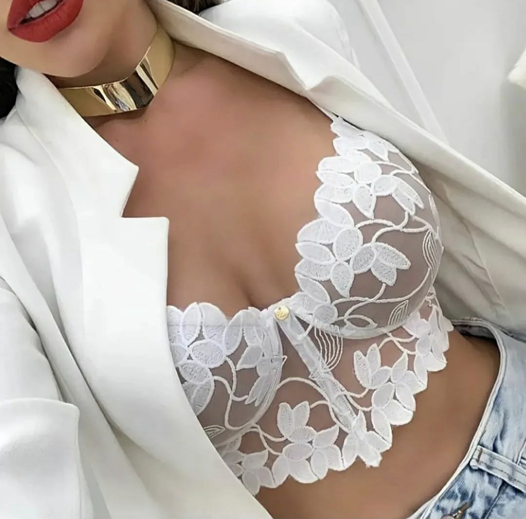 Conjunto Guippir Luxo : sutiã formato cropped que você pode combinar também nos seus look que vai arrasar em qualquer lugar. Sutiã com 3 fechos bem reforçado com alta sustentação a calcinha no formato de fio duplo alça grossas confortável e renda.